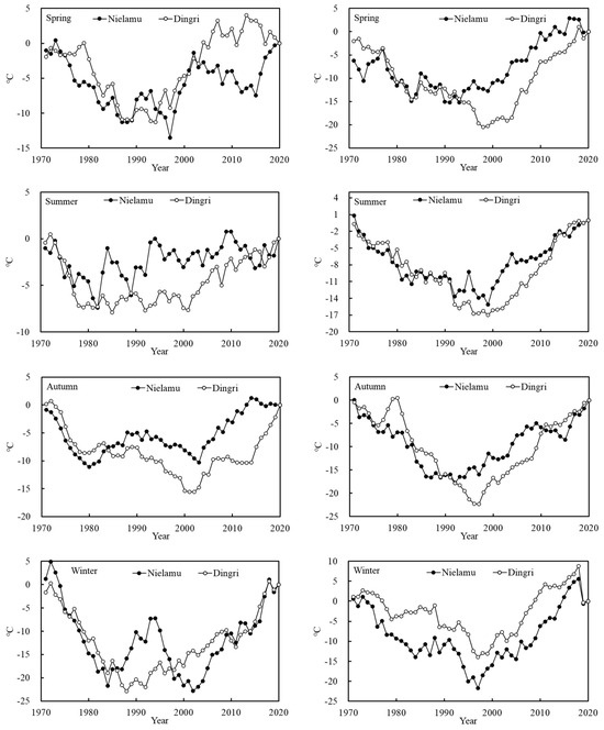 On the seasonal scale, and are increasing during the period of 1971–2020, but different patterns of change are found at Nielamu and Dingri (Table 4). At Nielamu, the in autumn and winter show a statistically significant increasing trend at a 95% confidence level, and the trends increase at the rates of 0.063 and 0.023 °C per year, respectively. There is a slight increase with the rates of 0.032 and 0.017 °C per year in spring and summer (not statistically significant at the level of 95%). has a statistically significant increasing trend at a 95% confidence level in summer and autumn with the rates of 0.032 and 0.043 °C per year, while an insignificant increasing trend is detected in spring and winter by 0.034 and 0.048 °C per year, respectively. On the other side, the seasonal series at Dingri exhibit a statistically significant increasing trend at a 95% confidence level, except for spring, showing a slight and insignificant increasing trend, and increasing trends with a significance at a 99% confidence level are detected in autumn and winter. At Dingri, the seasonal have increased by 0.014, 0.023, 0.038, and 0.067 °C per year, for spring, summer, autumn and winter, respectively. The seasonal series at Dingri have experienced a statistically significant increasing trend at the level of 99% in spring, summer, and autumn by 0.056, 0.039, and 0.047 °C per year. There is only a winter at Dingri showing a slight and insignificant increasing trend with the estimated rates of 0.056 °C per year. The greatest magnitude of the increase for seasonal occurred in winter at Nielamu and Dingri, while that for occurred in winter at Nielamu and in spring at Dingri. The seasonal increasing trends of Dingri seem more dominant than those of Nielamu, so it is for the increasing magnitudes, which are consistent with the existing research [24].