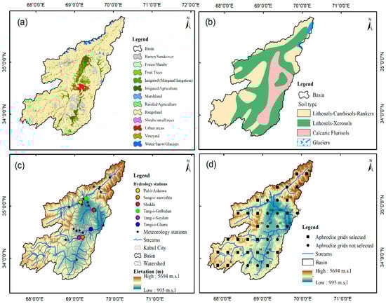 (a) The land use, (b) soil classifications, (c) hydro-meteorological station’s location, and (d) APHRODITE-selected station’s map in the UKRB.