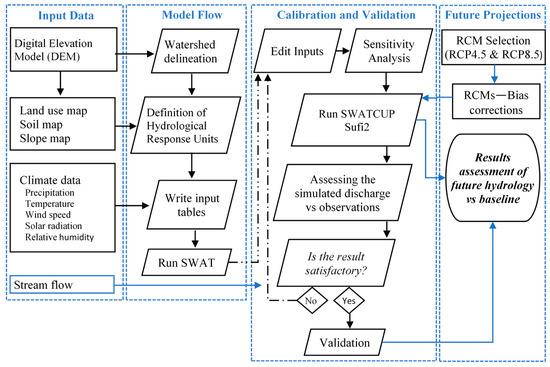 where bmlt is the melt factor (mm H2O/[day·°C]), bmlt6 is the melt factor for 21st June (mm H2O/[day·°C]), bmlt12 is the melt factor for 21st December (mm H2O/[day·°C]), and dn is the number of days in the year, 365 [7,27]. Once all the processes were completed, the SWAT simulation was initiated. The model was configured to run continuously from January 2009 to December 2019, with the first year (2009) selected as the warm-up period. Following the calibration and validation of the model, the bias-corrected precipitation and temperature from the RCMs’ output were employed to examine the effects of climate change on runoff in the UKRB. The methodology used in this study is summarized in Figure 3.