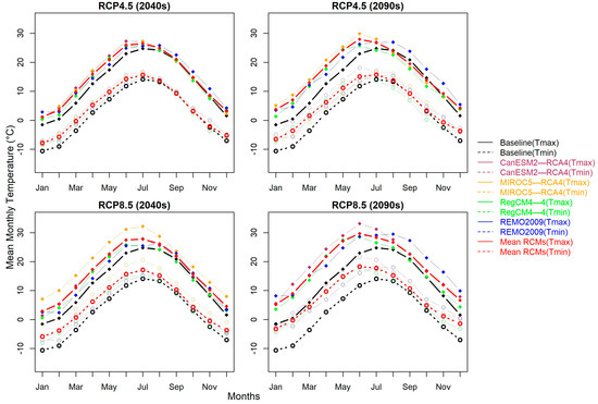 The monthly maximum and minimum temperatures after bias correction were obtained from RCMs under two RCP4.5 and RCP8.5 scenarios. The baseline period is represented by the black line, while the mean from the RCMs is shown by the red line.