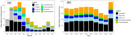 The simulated water balance components for monthly (a) and annual (b) periods in the UKRB.