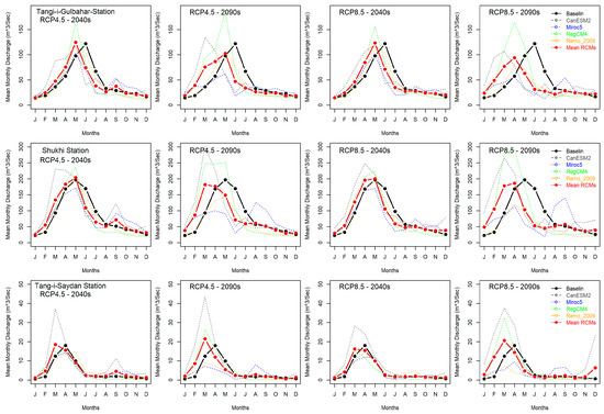 Future response of water flow compared to the baseline plots under RCP4.5 and RCP8.5 for Tang-i-Gulbahar station, Shukhi station, and Tangi-Saidan station. The black line shows the discharge for the baseline (1986–2005), and the red line shows the discharge for mean RCMs in two future periods of the 2040s and 2090s.