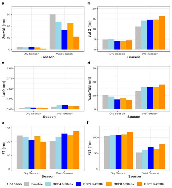The seasonal changes in (a) snowfall, (b) surface runoff, (c) lateral flow, (d) total water yield, (e) ET, and (f) PET for dry and wet seasons in the UKRB. The results are shown for the baseline, 2040s, and 2090s periods under RCP4.5 and RCP8.5.