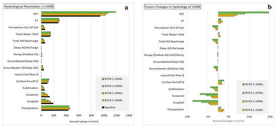 The results also show that an increase in temperature is impacting the actual ET and PET. The annual ET and PET showed an increase in both RCP4.5 and RCP8.5 compared to the baseline in the UKRB. The ET increased under RCP4.5 by 13 mm in the 2040s and by 11 mm in the 2090s, while under RCP8.5, the ET significantly increased by 21 mm and 14 mm for the 2040s and 2090s, respectively. The increase in annual ET is more prominent in the 2090s under RCP8.5 (Figure 9). The annual lateral soil flow contribution is very low in the UKRB and, therefore, for the future, climate change analysis did not show any significant changes under both RCPs. Overall, the annual runoff is projected to increase; consequently, there will be more surface runoff in the basin annually, but there is also likely to be a problem with uneven seasonal and spatial distribution of water resources.