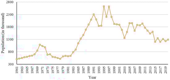 Although the study utilizes data from 1970 to 2020, Figure 3 and Figure 4 present cattle and goat population trends since 1961. For cattle, there was a sharp upward trend from 1966 until 1977, when numbers reached the highest figure ever of 3.1 million. From then on, the population kept fluctuating until it went into a downward mode in 2010. Figure 1 shows that during the five years preceding 2020, the population did not reach 1.5 million, which is approximately half of the highest number ever recorded. This indicates that production has been less satisfactory.