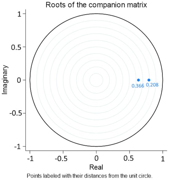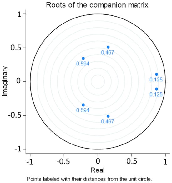 Tests were also conducted after the model estimation to identify potential model misspecifications and issues like non-normality, autocorrelation or serial correlation, and instability to check the robustness of the model. Those were also conducted to improve the model reliability of the results. The post-diagnostic tests performed were the Granger causality, serial correlation LM, normality tests, and stability. The Granger causality test determines whether one variable can predict the performance of another [99,100], while the Serial correlation LM, also known as the Autocorrelation test, measures the similarity between a time series set and its lagged values [101,102]. The normality test verifies whether a data set is distributed along a normal distribution curve. Results and interpretation may not be reliable if normality has been violated [103,104]. Similarly, VAR models also require stricter stability conditions to be met.