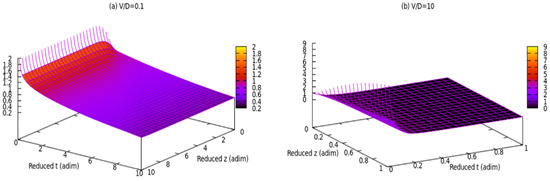 In Figure 1, we illustrate the variations in dimensionless coordinates (used here as ‘adim’), namely reduced z(adim) and reduced t(adim), with respect to density dependencies. It is evident that, at a dimensionless rate of , experiences an initial increase with reduced z(adim) for small values of reduced t(adim) and subsequently decreases. Conversely, for larger reduced z(adim), decreases with reduced z(adim). In the case of a dimensionless rate , increases with reduced z(adim) for small, reduced t(adim) values and then stabilizes, remaining constant. Meanwhile, for larger reduced t(adim), remains constant throughout.