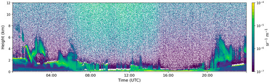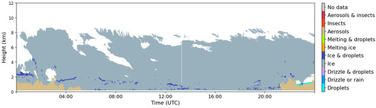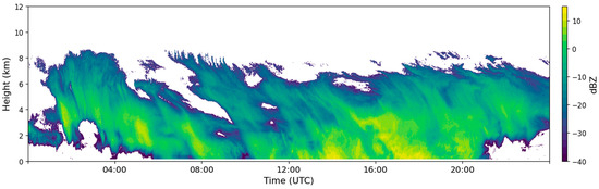 Figure 3 presents the overall atmospheric time-series characterization obtained from the Cloudnet database [27] using both ceilometer and radar reflectivity factor data. The atmosphere is dominated by large ice cloud particles. It should be noted that, for this application, the ceilometer is generally unsuitable as a data-collecting platform. Additionally, applications related to laminar channels extrapolated in the atmosphere through multifractal theory have only been developed using ceilometer or lidar data so far. The ceilometer is unable to obtain higher altitude data in cloudy conditions due to oversaturation of the backscattered light sensor, as shown in Figure 4. Therefore, it is necessary to use radar reflectivity factor data, as shown in Figure 5. This marks the first instance of radar data being employed for laminar channel applications.