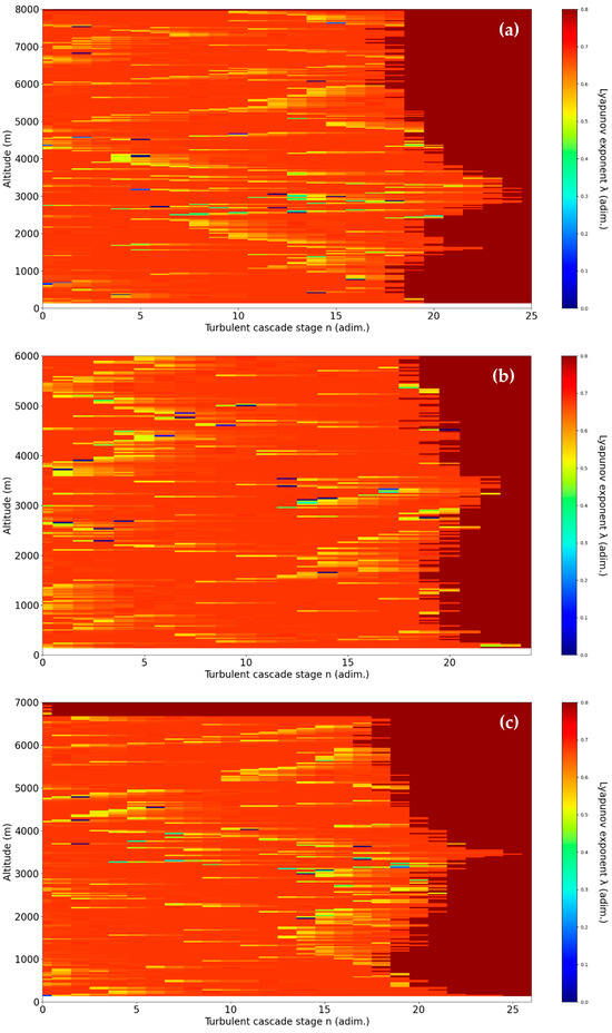 One important factor is the correlation between Lyapunov exponents and laminar channels, which can be analysed through bifurcation diagrams and logistic maps [12,13,14]. By using inequalities related to Lyapunov exponents, it is possible to identify the presence of laminar, periodic, or non-chaotic behaviour at specific scales. This approach utilises the relationship between the logistic map, which is known for its period-doubling behaviour and chaotic regimes, and the equations that govern atmospheric velocity fields, though in an approximate manner.