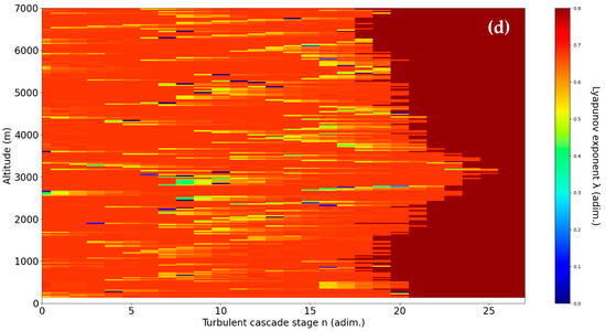 In Figure 6c, stability can be seen by the raw data and by the laminar analysis; however, the analysis shows ascending laminar channels at higher altitudes. It is visible, however, that the cloud formation is indeed slightly ascending at higher altitudes in this instance, and thus the laminar analysis correctly predicts atmospheric behaviour. Once again, in the instance analysed in Figure 6d, we are expecting stability, and stability is indeed found. Another interesting pattern is noticed in the analysis, and it must be explained: the peak that appears in the turbulent cascade stage axis always appears in areas with the largest number of backscattering bodies. This occurs because high numbers of turbulent cascade stages indicate areas of very low dissipation, and thus, in such areas, cloud formations are dissipated much slower and airborne ice densities increase. It is then apparent that the laminar analysis can show which areas of the profile have the most airborne ice.