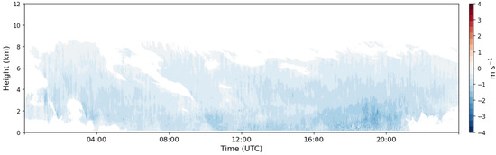 Figure 6a accurately describes the descent of cloud formations through lower altitude descending laminar channels. However, it is interesting to note that weak ascending laminar channels are observed at higher altitudes. The explanation is that in this region, the top of the cloud formation does not descend but exits the profile range of the radar reflectivity factor. In other words, that part of the cloud is ascending in a direction that is not accessible to the radar, and thus it appears to be descending. The laminar analysis proves to be useful in differentiating such cases.
