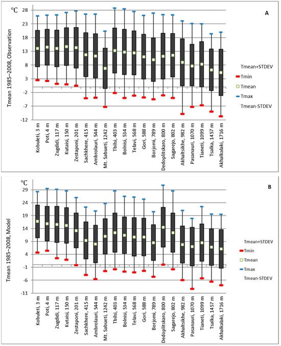 Figure 2 shows the statistical characteristics of actual and model data on average monthly air temperature for 20 stations in Georgia from 1985 to 2008: average annual air temperature, standard deviation, and maximum and minimum values of average monthly air temperature. In Figure 2, from left to right, the stations are arranged by physical–geographic area and site elevation above sea level. The stations from Kobulti to Mt. Sabueti are in the climatic district of western Georgia, and the stations from Tbilisi to Akhalkalaki are in the climatic district of eastern Georgia. The heights of the stations are indicated in the figure.