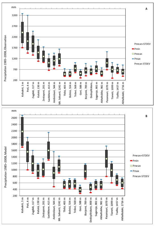 Figure 3 presents the statistical characteristics of the actual and model data of the annual sums of atmospheric precipitation for all the stations indicated above and the period of observation: the average annual amount of precipitation, standard deviation, and maximum and minimum values of the annual amount of precipitation. In both Figure 2 and Figure 3, the stations are arranged by climate zone and elevation above sea level. From Kobulti to Mt. Sabueti is the climatic district of western Georgia, and from Tbilisi to Akhalkalaki is the climatic district of eastern Georgia. The elevations of the stations are indicated in the figures.