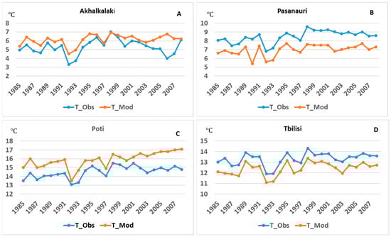 Long-term course of observational and model mean annual air temperatures of Akhalkalaki (A), Pasanauri (B), Poti (C), and Tbilisi (D) stations.