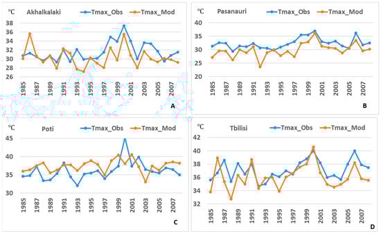 Long-term course of observational and model absolute maximum air temperatures of Akhalkalaki (A), Pasanauri (B), Poti (C), and Tbilisi (D) stations.