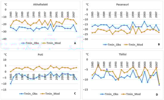 Long-term course of observational and model absolute minimum air temperatures of Akhalkalaki (A), Pasanauri (B), Poti (C), and Tbilisi (D) stations.