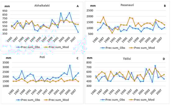 Long-term course of observation and model average annual precipitation amounts of Akhalkalaki (A), Pasanauri (B), Poti (C), and Tbilisi (D) stations.