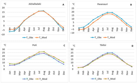 From Figure 4, it is clear that the course of observational and model data is identical, which is expressed in very high values of correlation coefficients; however, model temperature values do not always coincide or are close to the observational material, and they often differ by several degrees. In addition, in one case, the observational data exceed the model data, and in the other case, on the contrary, the model data exceed the observational data. In particular, according to Figure 4, at the Akhalkalaki and Poti stations, the model data exceed the observational data, and at the Pasanauri and Tbilisi stations, the observational data exceed the model data. Moreover, the difference between them sometimes exceeds several degrees.