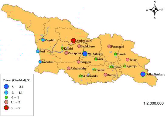 Figure 9 shows the spatial distribution of the bias between observation and model average annual air temperatures. The gradation −1–1 °C can be taken as the range of natural temperature fluctuations. It includes most of the stations in eastern Georgia, as well as Kutaisi. In Pasanauri, Telavi, Bolnisi, Akhaltsikhe, Borjomi, Zestaponi, and Sachkhere, the model underestimates the observation temperatures, and the bias between the observation and model temperatures is positive and falls into the 1.1–3 °C gradation. While in Poti, Kobuleti, and Zugdidi, the bias is negative and falls −3–1.1 °C. In Ambrolauri, the bias between the observation and model data is positive and is in the range of 31.1–5 °C; in Dedoplistskaro and Mt. Sabueti, the bias is negative and falls in the range of −5÷–−3.1 °C.