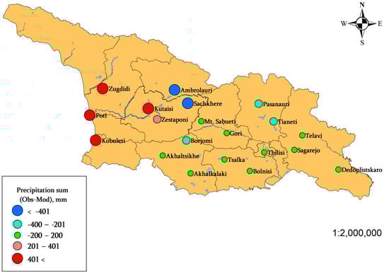 Atmospheric precipitation is a very variable element. The coefficient of variation, which characterizes the natural fluctuation of annual precipitation sums on the territory of Georgia, ranges from 0.15 to 0.30 or more. Therefore, with an annual precipitation sum of 1000 mm, a deviation of the model data from the actual data by even 300 mm is acceptable. This condition is largely satisfied at most stations, although in some cases, the difference significantly exceeds this criterion. If we consider the differences between the average long-term observation and model data of annual amounts of atmospheric precipitation, then 10 meteorological stations fall into the gradation of −200÷–200 mm, which is a range close to the natural fluctuation of precipitation, 4 meteorological stations fall into the gradation of 200–400 mm, and 6 meteorological stations fall within a gradation of 400 mm or more. These are the following stations: Ambrolauri, Kobuleti, Kutaisi, Poti, Sachkhere, and Zugdidi. Except for the listed stations in general, the results of modeling annual precipitation sums can also be considered satisfactory.