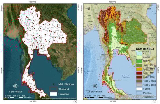 (a) Thailand boundary and meteorological station points, (b) Digital Elevation Model: DEM of Thailand (Applied from USGS Earth Explorer; source: https://earthexplorer.usgs.gov/ (accessed on 31 May 2023)).
