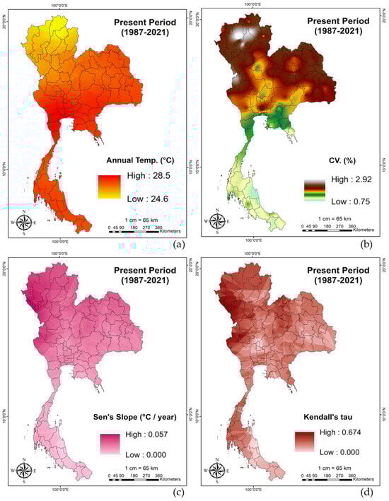 The spatial distribution in Thailand during 1987 to 2021 (a) Annual Temperature (Tann), (b) Coefficient of Variation (%CV), (c) Sen’s slope (°C/year), and (d) Kendall’s tau value.