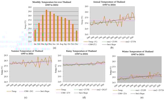 (a) Monthly Temperature in time series during 1987 to 2021, (b) Annual Temperature in time series during 1987 to 2021 (orange line), Cumulative mean: CSM through the period (pink line), CSM before and after abrupt change (green and red lines), Sen’s slope value (black line), (c) Summer Temperature in time series during 1987 to 2021 (orange line), (d) Rainy Temperature in time series during 1987 to 2021 (orange line), and (e) Winter Temperature in time series during 1987 to 2021 (orange line).