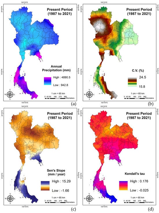 The spatial distribution in Thailand during 1987 to 2021 (a) Annual Precipitation (Prann), (b) Coefficient of Variation (%CV), (c) Sen’s slope (mm/year), and (d) Kendall’s tau value.