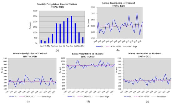 As the pink line graph in Figure 5b–e and the values in Table 8 reveal, CSM values for annual, summer, rainy, and winter were about 1596.3, 376.0, 871.1, and 349.1 mm. The pattern of rainfall values fluctuated, indicating that increasing values alternated with decreasing values throughout the whole period. Moreover, the homogeneity test of data and abrupt change analysis at a significance level of 95% showed that the data were homogeneous in most of the meteorological stations in Thailand, and there was no abrupt change due to the fluctuation of the values.