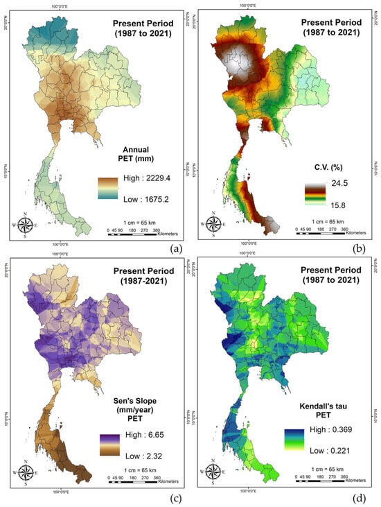 The spatial distribution in Thailand during 1987 to 2021 (a) Potential Evapotranspiration (PETann), (b) Coefficient of Variation (%CV), (c) Sen’s slope (mm/year), and (d) Kendall’s tau value.