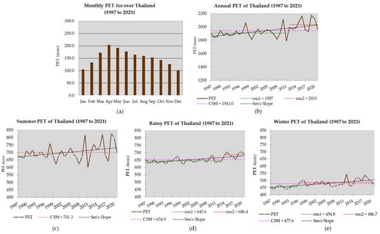 The annual potential evapotranspiration (PETann) values were analyzed by temperature and precipitation data, which were collected from 104 meteorological stations. The PETann values of Thailand were in the range of 963.7 to 2368.2 mm. The spatial distribution map of PETann for 1987 to 2021 is illustrated in Figure 6a, showing that the high PETann pattern was identical to the PETann pattern in the Mekong River Basin, with the high PETann appearing in the Central region of Thailand then gradually fading in the next area [79], similar to the pattern of the Tann spatial distribution as shown in Figure 1a. The monthly PET over Thailand as illustrated in Figure 7a also shows the same pattern as the monthly temperature in Figure 2a, indicating that the PET was rapidly climbing from the first month, then hit the peak in April, and after that the PET was gradually declining until reaching its lowest values in the winter season, especially in December.