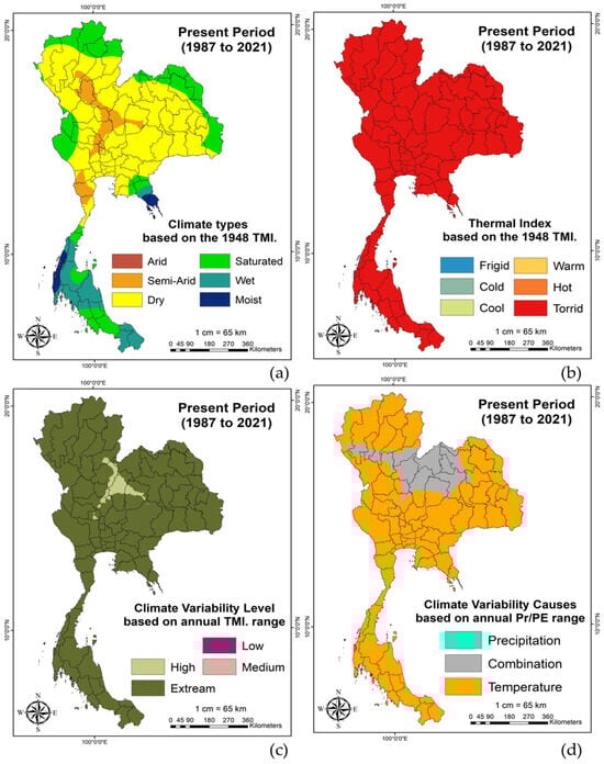 The spatial distribution in Thailand during 1987 to 2021 according to the New Thornthwaite Climate Classification, (a) moisture type, (b) thermal index, (c) seasonality types, and (d) seasonality causes.