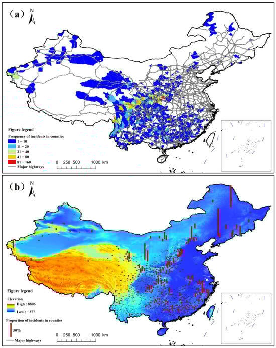 Spatial distribution of highway geomorphological incidents in counties of China from 2019 to 2022: (a) Occurrence frequency; (b) Proportion of incidents.
