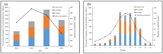 Occurrence frequency of highway geomorphological incidents in China from 2019 to 2022 versus rainfall: (a) Yearly totals; (b) Monthly totals.