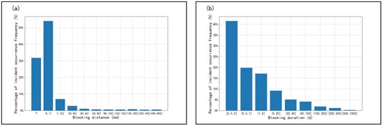 Distribution of the proportion of highway geomorphological incidents in China from 2019 to 2022: (a) Blocking distance (0 km represents the frequency of incidents causing road blockage only at the incident point, (0, 1] km represents the frequency of incidents within the range of >0 km and ≤1 km); (b) Blocking duration ([0, 0.5] represents a blockade duration of ≤12 h, (0.5, 1] represents a blockade duration of >12 h and ≤24 h, (1, 5] represents a blockade duration of >1 day and ≤5 days).
