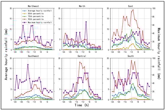In the 24 h before an incident, the average hourly rainfall across all regions typically increases before decreasing, with peak precipitation periods often occurring around twelve hours before the event (Figure 5). The average hourly rainfall in East, Central, and South China is distinctly higher than that in Northwest, North, and Southwest China. In the former regions, the maximum average hourly rainfall can attain heavy rain levels. In contrast, North and Southwest China might encounter moderate rainfall, whereas the Northwest experiences lighter rainfall. In most regions, more than 50% of the total rainfall amounts are concentrated in the twelve hours preceding the occurrence of the incident. Notably, East, Central, and South China exhibit significantly higher rainfall quantities across all percentiles compared to other regions during this critical twelve-hour period.