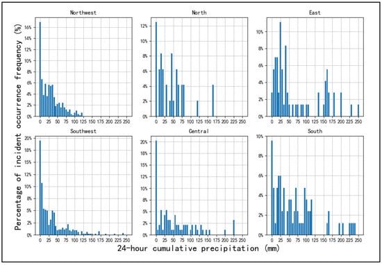 In various regions, the frequency of incidents within the last 24 h exhibits a declining trend with increasing precipitation amounts, although the intervals of incident-causing precipitation differ (Figure 6). In the Northwest and Southwest, the precipitation intervals that precede incidents are more tightly concentrated, with a higher frequency of incidents occurring at levels below 40 mm. On the other hand, North, East, Central, and South China exhibit broader ranges of critical precipitation intervals. In North China, the predominant range for incidents spans from 10–75 mm; in East China, it falls between 5–50 mm; and in Central and South China, it extends from 5–120 mm. Furthermore, these regions also experience secondary peaks in the frequency of incidents at precipitation levels exceeding 150 mm.
