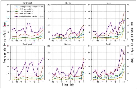 When examining the maximum daily rainfall, most regions show a fluctuating upward trend, with the greatest values typically occurring around the 7th day and the day preceding the incident. The Southwest and South China can reach over 300 mm, while other areas exceed 200 mm. A noticeable pattern emerges with a substantial increase in maximum rainfall occurring three days before the incident, and this pattern closely correlates with the occurrence of extreme precipitation within a day of an incident.