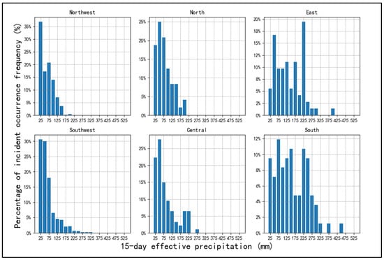 The proportion of effective precipitation frequency over the preceding 15 days reveals distinct regional characteristics (Figure 8). In the Northwest and Southwest, the frequency of incidents decreases rapidly with increasing precipitation, with 80% of incidents concentrated within 75 mm. In North and Central China, the frequency initially increases and then decreases with precipitation. Approximately 70% of incidents are concentrated within a range of 75 mm of precipitation, while incidents induced by effective precipitation exceeding 150 mm account for approximately 5% of the total. In East and South China, the frequency trends are not significantly affected by increased rainfall, with all effective precipitation levels up to 200 mm contributing approximately 5–10% to incident occurrences.