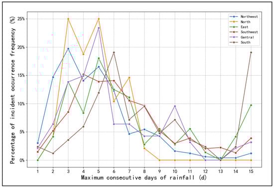 In most regions, there is a unimodal distribution of incident frequency concerning the longest continuous span of rainfall. The highest frequencies are typically concentrated within the range of 3 to 6 days, and the cumulative proportion for four days reaches over 70% (Figure 9). The Northwest region shows a peak at 3 days, the Southwest at 4 days, and North, Central, and East China at 5 days, while South China peaks at both 6 and 15 days.