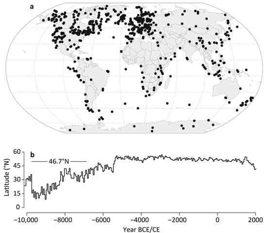 Site locations of the 1319 proxy records used for reconstructing Holocene GSTs (a), and changing latitudinal mean calculated in 50-year bins since 10,000 BCE (b). The value of 46.7° N is the average latitudinal mean of the proxy network throughout the Holocene.