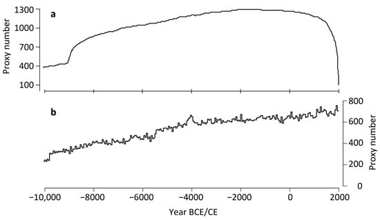 Replication of the Holocene proxy network since 10,000 BCE, (a) considering the periods covered by each of the 1319 proxy records included in the global network, and (b) considering the sum of proxy values in 50-year bins over the past 12,000 years. The latter is a count of the data points across all proxy records and does not consider the linear interpolations between data points in each of the records.