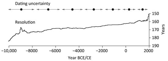 Proxy network resolution and dating uncertainty. Top panel shows schematically the changing dating uncertainty of single data points characteristic for Holocene proxies. Bottom panel shows the decreasing mean resolution (i.e., spacing between data points) over the past 12,000 years.