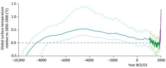 Recorded and reconstructed GSTs since 10,000 BCE from the IPCC AR6 Technical Summary (p. 61) []. The purple curve shows instrumental temperatures recorded since 1900 CE at annual resolution (HadCRUT 5) []. The green and blue curves are temperature reconstructions derived from multiple proxies from 1000 to1900 CE and 10,000 BCE to 1000 CE at decadal and centennial resolutions, respectively [,]. The light color curves are uncertainty estimates. All temperatures are shown as anomalies from an 1850–1900 CE reference period.