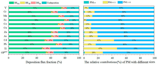 Deposition flux fractions of elements and OPDTT of PM10 and the relative contributions of PM with different sizes to total elements and OPDTT of PM10 in the whole respiratory tract. Note: head airway, HA; tracheobronchial, TB; and pulmonary, PA. Un-deposition is elements and OPDTT of PM10 not deposited in respiratory tract during respiration. The average deposition flux of elements and OPDTT of PM10 is roughly calculated based on the deposition efficiency of size-resolved PM by ICRP models and a hypothetical inhalation rate of 0.66 m3 h−1. The % are for mass concentrations.