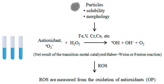 Generally speaking, on their surface, particles contain soluble transition metals such as Fe, Cu, Mn, Cr, and V that can generate ROS through Fenton-type reactions and act as catalysts by Haber–Weiss reactions (Figure 4) [7,28]. Taking Fe as an example, ferrous iron (Fe2+) reduces hydrogen peroxide (H2O2) with the formation of hydroxyl radicals (•OH) and the oxidation of ferrous iron to ferric iron (Fe3+). This reaction can be recycled by reductants such as superoxide anions, DTT glutathione, and ascorbic acid by reducing Fe3+ to Fe2+. All ROS were measured from the oxidation of DTT. Because only the soluble forms of metals participate in redox reactions, correlations between OPvDTT and total metal mass concentrations depend on the fraction of total metal that is soluble. Moreover, the different correlations between OP and elements in PM with different sizes are influenced by chemical form, oxidation and reduction behavior, and capacity of ROS generation or induction, for example, Fenton-type, Haber–Weiss reactions, etc. [12,28]. Moreover, correlations do not show causal relationships between OP assays and PM components, especially since particulate species are often highly covariate [28]. More research on the solubility and morphology of metals is needed to reveal their correlation mechanisms.