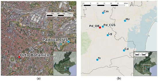 Location of the ARPAV meteorological stations listed in Table 1: (a) Veneto region; (b) zoom on Padua center.