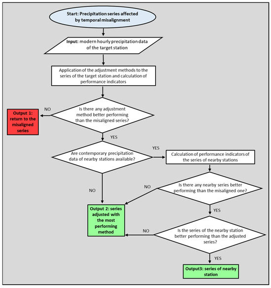 The overall methodology applied to solve the issue of the temporal misalignment of a precipitation series visualized in Figure 2 includes the main steps described hereunder. The hourly precipitation measurements of the target station were taken as input of the process.