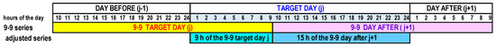 Figure 3. Overlapping between the hours of observation of 9–9 series and the adjusted series, with the latter composed of Fj = 9 h of the target day j in the 9–9 series, and Fj+1 = 15 h of the day after (j + 1) in the 9–9 series.