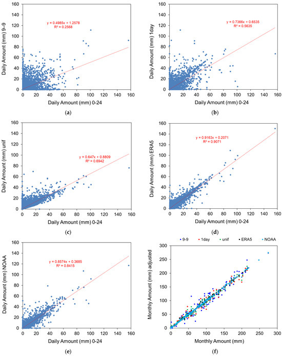 Figure 4a–e show the scatter plots of the 0–24 vs. the 9–9 series adjusted using the adjustment methods described in Section 2.4. Linear regressions were added with the resulting equations and R2 values. The simple 1-day method significantly improves the linearity between the original and adjusted series, but the methods based on reanalysis perform better than the others. The same comparison at the monthly level (Figure 4f) indicates, as expected, that the choice of adjustment method is not as crucial as at the daily level, in particular in terms of linearity (Table 4). Nevertheless, the methods based on reanalysis give a lower RMSE than the other methods (Table 4).
